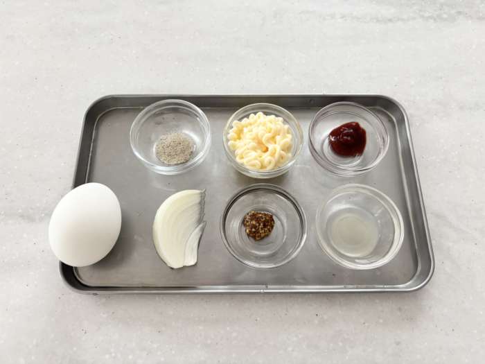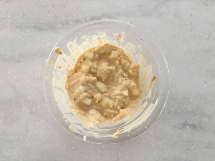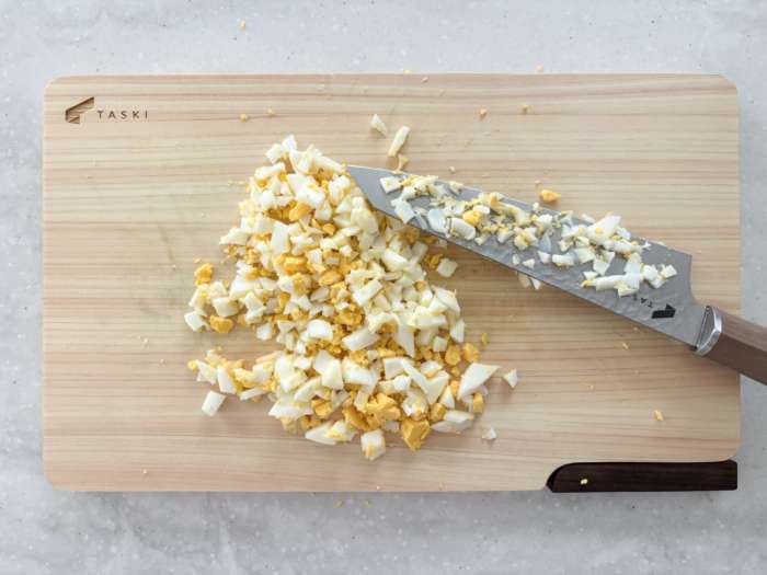 1. Finely chop the onion and boiled egg. Then, put in a bowl.