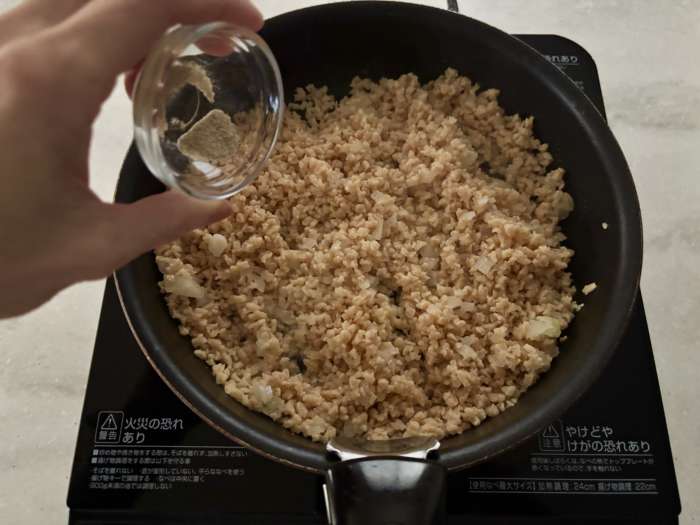 4. Stir-fry ground soybean meat, green pepper and onion in a pan with medium heat. Season with salt and pepper.