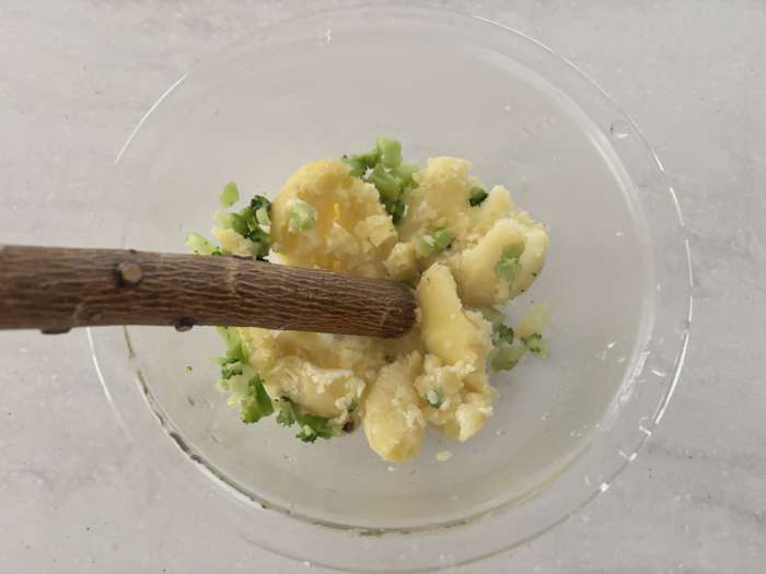2. Steam potatoes and broccoli in a steamer. When it becomes soft, mush potatoes and chop broccoli very well.
